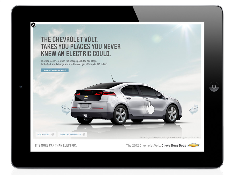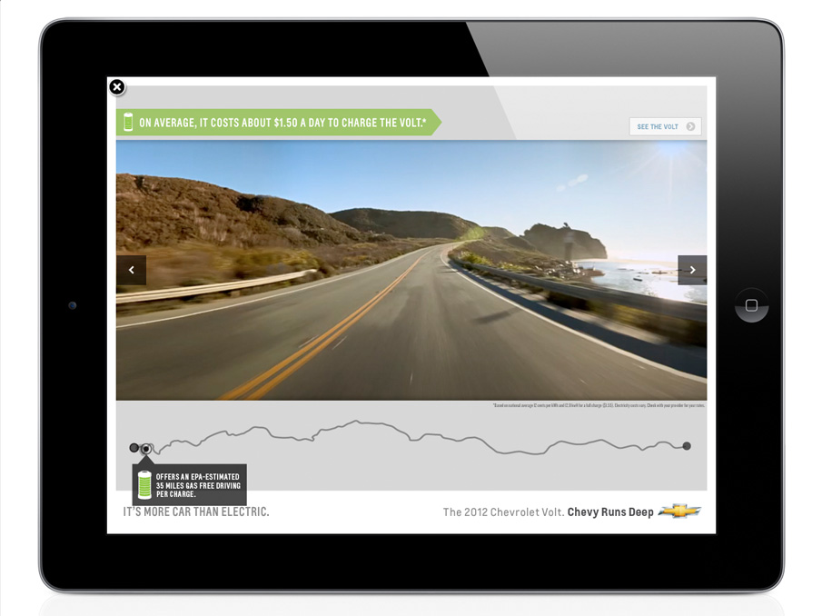 Mobile Interactive ExperienceTo help launch the Chevy Volt, we created an interactive first-person experience that opened on a scenic drive down America's favorite roads. During the drive, users would see the car switch from electric to gas as they progressed and could tilt the iPad to look left or right. Afterward, we invited users to hop in and explore the Volt.